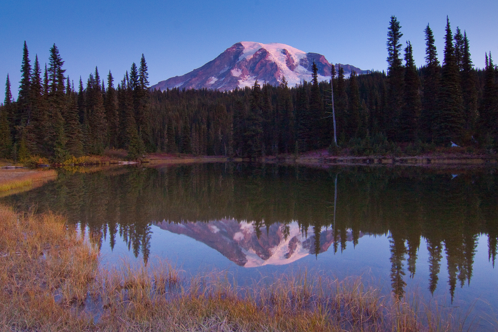 A long day. I got up very early to drive to the Reflection Lakes in the hope of getting a nice shot of Mount Rainier at sunrise since the weather was finally clearing up. It was worth the early wake-up call! I arrived still in the dark so I was able to get a picture of the mountain as the first rays of sun touched it and the beautiful image was reflected in the lake below. It was a cold morning and there was frost on the grass surrounding the lake. It was a wonderful and peaceful experience. For this image I used a circular polarizer and a Singh-Ray 3stop soft step ND Filter to balance the light in the scene.