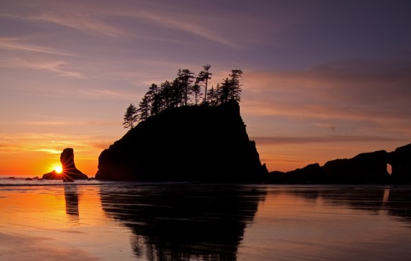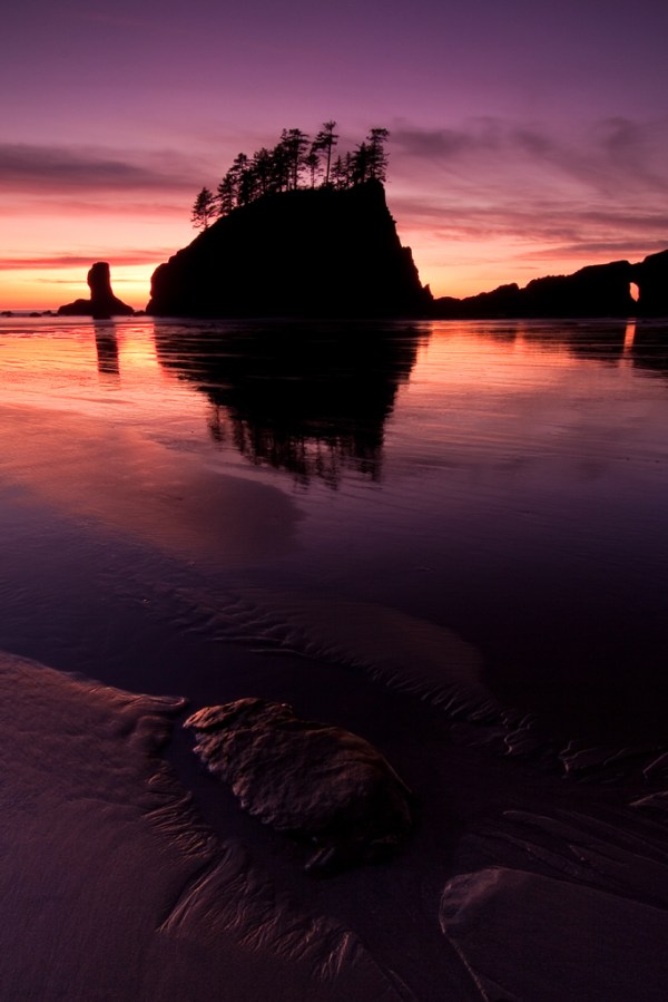 Afterward I headed back to the hotel, packed my belongings and drove 6 hours to La Push on the Olympic Peninsula. I had checked the tide forecast and was happy to see that I should have a nice low tide to photograph the sunset at Second Beach. I had never been to Second Beach before and was quite overwhelmed by the beautiful scenery. There is about a 1 mile hike through the forest and you will already get a glimpse of the sea stacks before you arrive at the beach. I was lucky to catch the sun as it was setting behind one of the sea stacks.