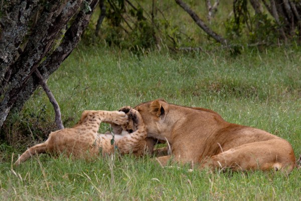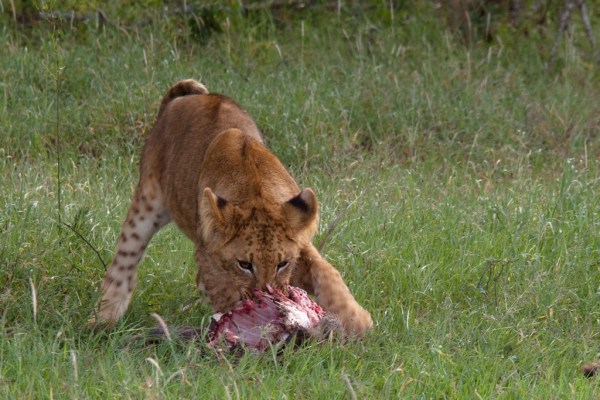 On our game drive we saw a lioness and her two cubs feeding on a kill. Even so the mother seemed to be quite tired, she was extremely patient with the antics of her offspring and we enjoyed watching them for quite a while.