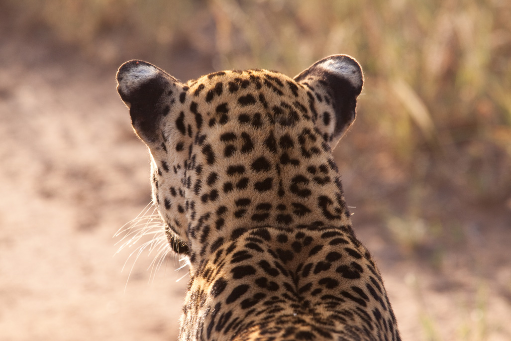 While we were on Safari, we were all hoping for pictures of wildlife actually somewhat facing the camera, or a nice profile shot. That sounds a whole lot easier than it is. It had gotten to the point were one of my safari mates stated: “We will go home with a hard drive full of butt shots and lone trees”. The “lone tree challenge” was already covered in a previous post, so here is my take on the “rear view” . While I was working on my images, I found some shots that I quite liked, even so the animal was facing in the opposite direction and I thought I would share them with you. I particularly like the first one, since it shows the white markings on the back of the ears, which leopards use for communicating with each other.