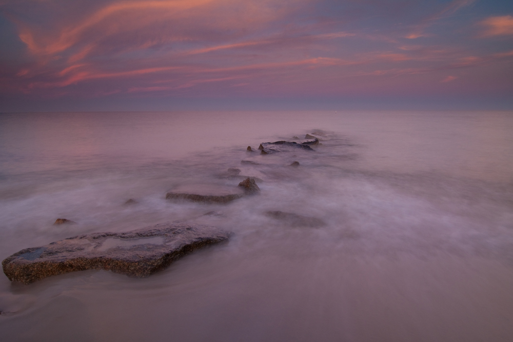 Beginning of this month I was able to spend a wonderful weekend on Cape Cod with a friend of mine. Long walks on a beautiful beach. At sunset the ocean was turned pink for a few brief minutes. This jetty provided a nice photo opportunity with the waves breaking over it.