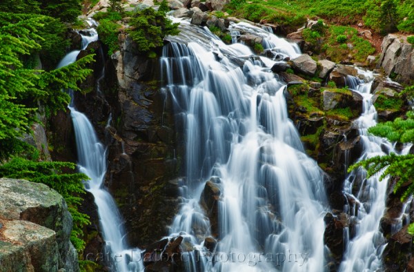I took this image of Myrtle falls in Mt. Rainier National Park beginning of August. This waterfall is often photographed with Mt. Rainier in the background. It was a slightly overcast and hazy day and the view of Mt. Rainier was rather unattractive, so I chose to concentrate on the waterfall itself.