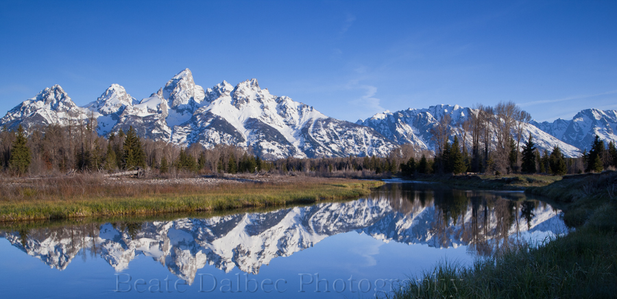 I just returned from 9 wonderful days in the Grand Tetons and Yellowstone National Park. My first time ever in the Grand Tetons (but certainly not the last)! Spring arrived rather late in the area this year – I was told by about 3 weeks. I was surprised to find the trees still bare and the day before my arrival it had snowed. The long range forecast was a rather mixed bag, but it was supposed to be nice the next day. So I decided to set my alarm early and head to Schwabacher Landing for the sunrise. It was a beautiful calm morning, the conditions were not right for a nice pink predawn light, but at least it offered some beautiful reflections.