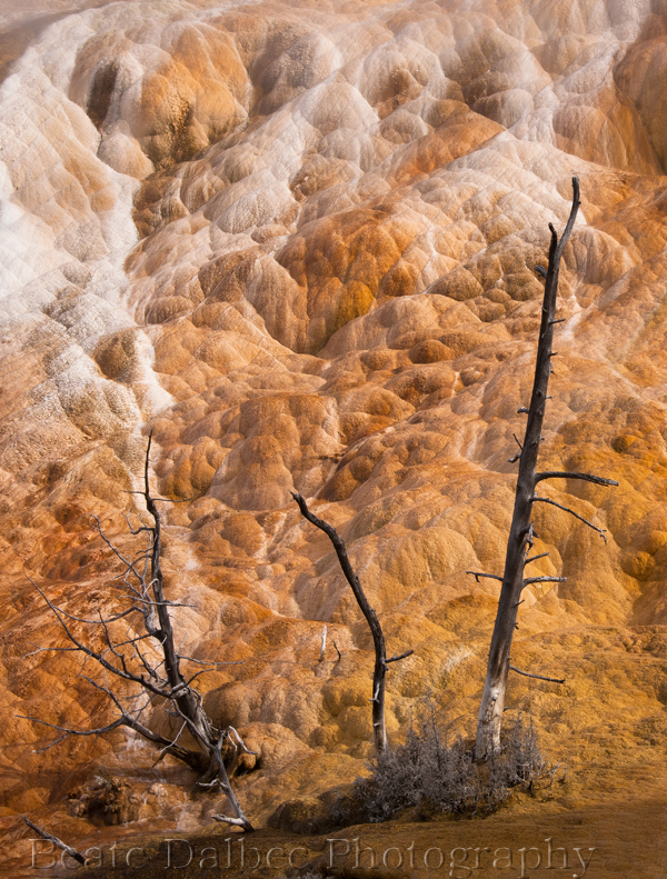Yellowstone is constantly changing. This became very evident to me at Mammoth hot springs. I had been there once before – 27 years ago – but still remembered the beautiful Minerva terrace. White terraces with blue water. It looked so beautiful and I was very much looking forward to photographing it. So you can imagine my surprise when instead I just saw grey rock! As it was explained on a sign, Yellowstone is always changing, springs dry up and might resurface at a later time, and new ones emerge. The image below is from one of these new sections. It started to form only 5 years ago and has since overtaken trees and a boardwalk. It’s not the Minerva terrace, but the colors were beautiful.