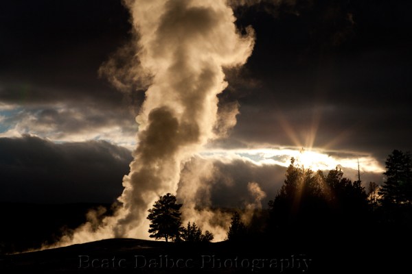 It had been raining all afternoon, dense cloud cover as far as the eye could see and I had pretty well given up any hope of photographing at sunset. We were staying in one of the cabins at the Old Faithful lodge (which I can highly recommend, by the way) and I decided to head to the visitor center to check on the next day’s forecast. I did not get very far, when the rain stopped, the clouds parted just enough to let the setting sun peek through and illuminate Old Faithful. In absolute record time I raced back to the cabin, grabbed my camera and was lucky to quickly find a composition I was happy with.Ā  Yellowstone is always full of surprises. You just need to be ready to take advantage of them!