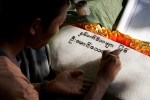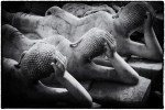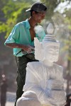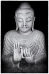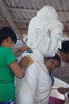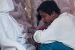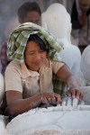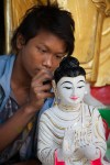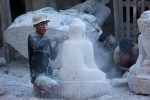 Mandalay has a reputation for its incredible marble carvers. Their skill has been passed down for generations.  Along marble street you will find workshops lining the street where Buddha statues of all sizes are carved out of the finest white marble. The marble is mined in quarries not far from Mandalay. A cloud of fine dust lingers over the area, so I used my camera raincover for dust protection. And don’t even think about changing lenses there!  Men seem to do most of the carving work, women do the finishing (polishing), after which the statues are painted and decorated with gold leaf. Before an important piece of work will get carved an astrologer will get consulted to pick an auspicious day, the stone will be blessed with holy water and offerings will be made.