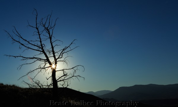 There are other interesting subjects besides the hills. This dead tree caught my eye and I managed to capture the setting sun in its branches.