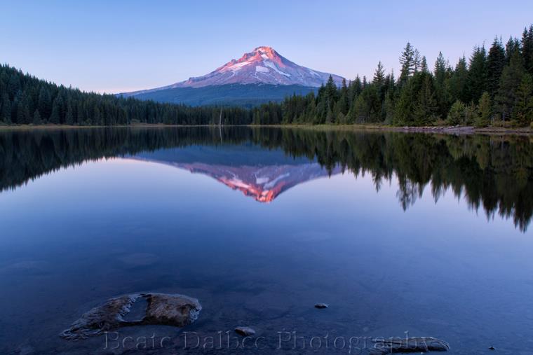 I had hoped that the clouds would stay for the sunset and turn to a beautiful pink, but it was not meant to be. But instead, the wind calmed down and so did the water in Trillium lake. I did get my reflection after all! And with some nice alpenglow on the mountain. Never give up too early!